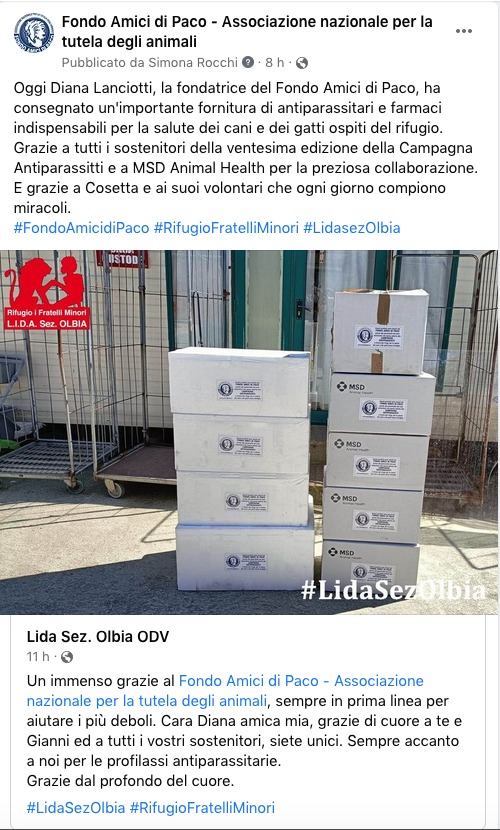 «Per i canili e i gattili la spesa per i prodotti antiparassitari è un grosso impegno economico», spiega Diana Lanciotti, fondatrice del Fondo Amici di Paco e da 23 anni instancabile organizzatrice della Campagna Antiparassiti. «Così come sottoponiamo alla profilassi antiparassitaria i cani e i gatti di casa, a maggior ragione è indispensabile trattare i cani e i gatti dei rifugi con prodotti efficaci, per prevenire malattie molto gravi e per incoraggiarne l’adozione. Ogni anno la campagna antiparassiti riceve molte adesioni, anche se le donazioni, seppur generose, non sono mai sufficienti a far fronte a tutte le richieste. Ma l’attività distintiva del Fondo Amici di Paco consiste proprio nel dare aiuti concreti. Quindi, a costo di immani sforzi, continuiamo su questa strada, per noi irrinunciabile.»
