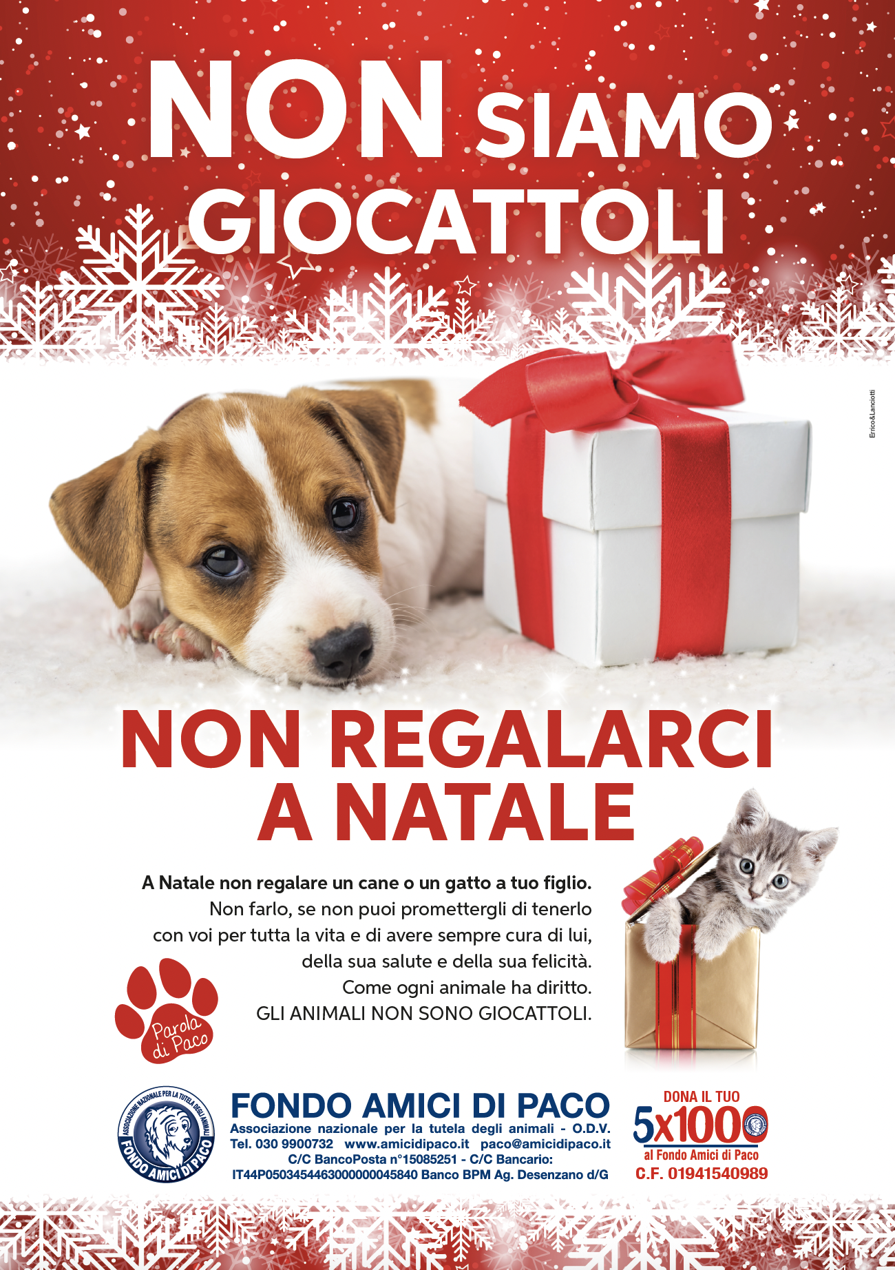 Come ogni anno il Fondo Amici di Paco promuove la campagna NON SIAMO GIOCATTOLI, NON REGALARCI A NATALE contro gli acquisti o le adozioni di cani o di gatti che, finita la novità, rischiano l’abbandono. Sono decine di migliaia i cani e i gatti abbandonati per strada ogni anno, con grossi rischi per la loro incolumità e la sicurezza stradale. Troppo spesso i cagnolini o i gattini regalati a Natale, magari fatti trovare come regali sotto l’albero, sono a rischio abbandono, anche se il fenomeno è in netto calo grazie alle campagne di sensibilizzazione condotte da anni dal Fondo Amici di Paco.