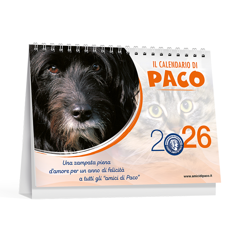 Diventato un “oggetto di culto” per migliaia di amanti degli animali che pur di averlo lo prenotano da un anno all’altro, il Calendario di Paco si presenta nella pratica versione da parete (15×49 cm) oppure da scrivania, per essere sempre a portata d’occhio e di mano e strappare un sorriso anche durante le ore di studio o di lavoro.