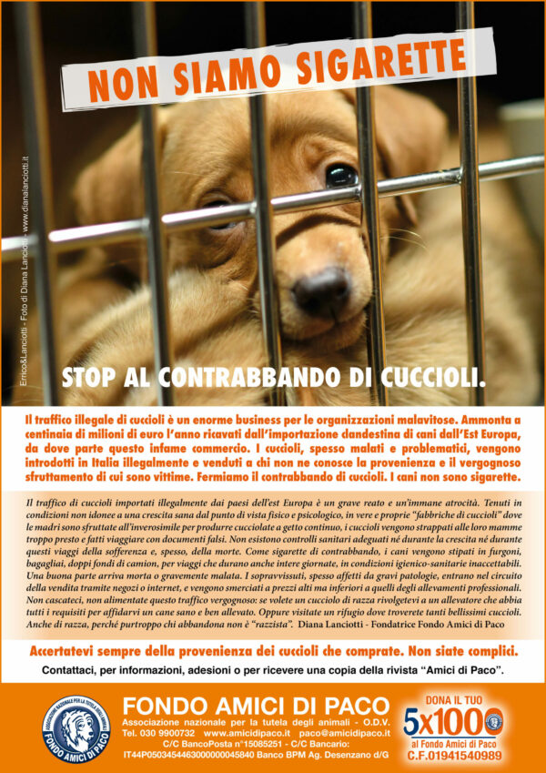 Da 26 anni il Fondo Amici di Paco si impegna a contrastare il randagismo con importanti campagne di sensibilizzazione che hanno radicalmente mutato leggi, regolamenti e usi per contrastare il fenomeno dell’abbandono. Con la nuova campagna NON SIAMO SIGARETTE l’associazione no profit scende in campo contro il traffico illegale di cuccioli, un triste fenomeno che…